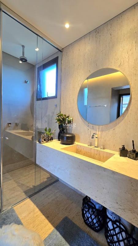 Residência de altíssimo padrão com 5 suítes (máster com closet), ambientes revestidos em madeira Cumaru e Travertino Romano, além de lareira e painéis em pedra Eclipse que reforçam a imponência do projeto.